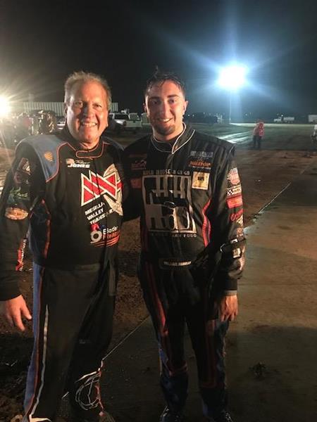 Michael made it two wins in a row with a crazy finish at Vado Speedway. Michael took the lead with a slider on Rick Ziehl about 10 laps into the race. On Lap 20 as Michael was slowed by some cars he was lapping, Ziehl closed in and drove his car into turn 3 so hard that he slid up and hit Michael in the Left rear breaking the LR shock and radius rod. At this point Michael had lapped the field up to 5th place. As he nursed his car around the track for the last 5 laps Ziehl and Don Grable got together running 1st and 2nd and Ziehl pulled off the track. Now Grable was also nursing a broken car around the track and Michael passed him on the last lap for a very unexpected win. After the race Michael celebrated the win in the pits with his Dad, Crew Chief Luigi and owner of Vado Speedway Royal Jones. Jones said that was the best non wing main event he has ever seen.