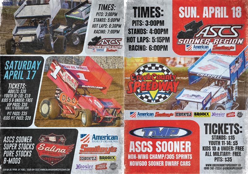 Saturday, April 17, opens at 5:00 P.M. with racing at 7:00 P.M. (CDT). Admission is $20 for adults, $10 for youth ages 6-10, and free for kids five and under. The American Bank of Oklahoma ASCS Sooner Region presented by Smiley’s Racing Products will be joined by Super Stocks, Pure Stocks, and B-Mods. Salina Highbanks Speedway is located at 3164 OK-20, Pryor, OK 74361. More information on the track is online at http://www.salinahighbanksspeedway.com.