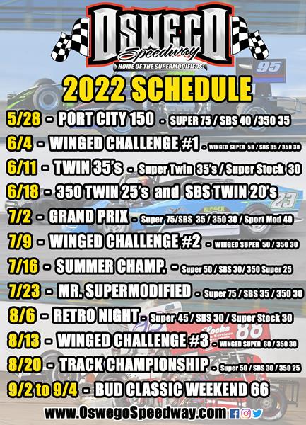 OSWEGO, NY (November 19, 2021) - Oswego Speedway officials are proud to release the full schedule of events for the track’s 71st season of action, set to begin on Saturday, May 28 with the return of the Port City 150 serving as the Season Opener.